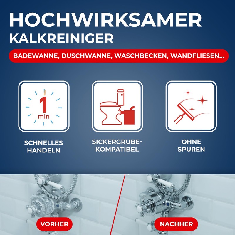 - Works quickly: the extra strong descaler works in 1 minute and thoroughly cleans thick and old limescale layers in the bathroom. It is suitable for septic tanks.