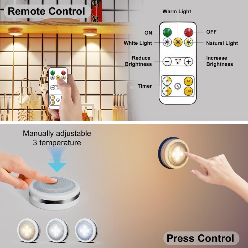 Featuring three adjustable color temperatureswarm white, cool white, and natural lightthese puck lights allow you to customize your lighting to suit any mood or setting. Whether you're cooking in the kitchen or organizing your wardrobe, you can create the perfect ambiance with just the push of a button.