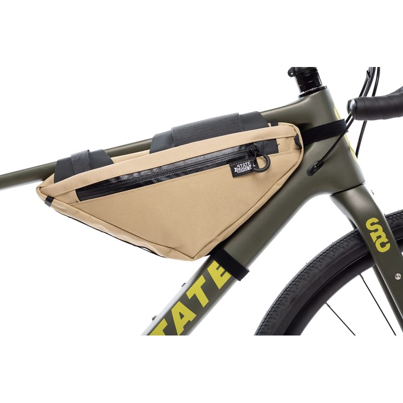 - TRIANGULAR BAG: The State Bicycle Co. Wedge Framebag has a total capacity of 2.5L space for daily use. It’s the perfect bag for a day trip or a weekend getaway. Great for bike touring, bike packing, and any other type of longer riding where more space is needed. The Wedge Frame pouch can be configured to fit on most bikes in your stable with the multi-point mounting system and the extra-long mounting straps.