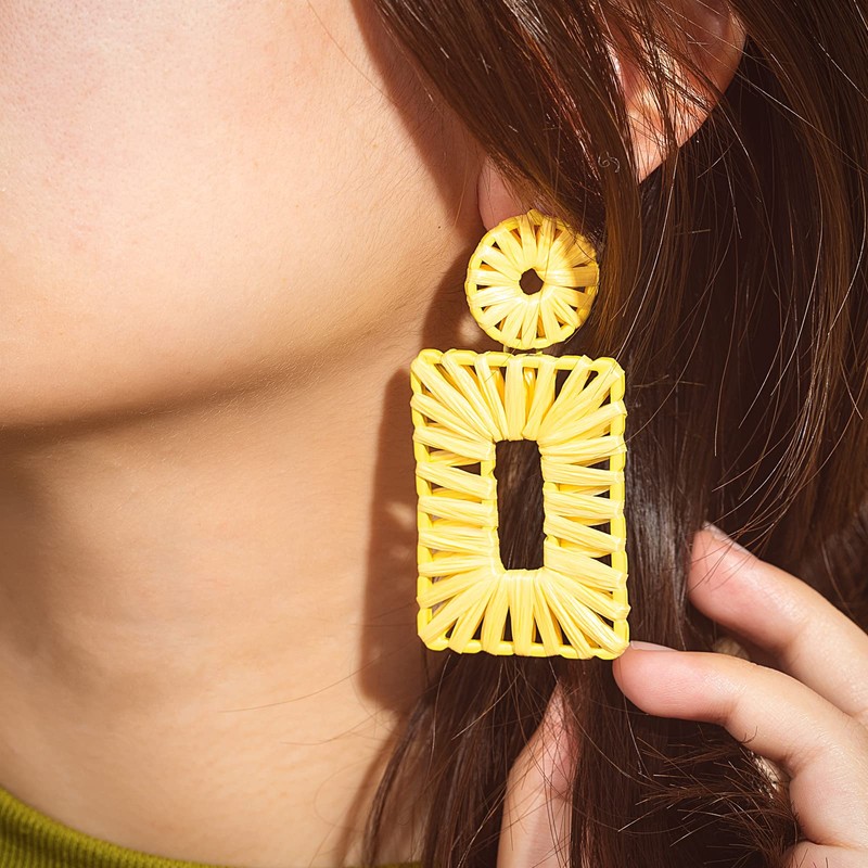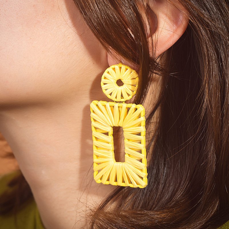 • Raffia Drop Earrings: Take your love for statement accessorizing to a new level of affection with the square raffia drop earrings.