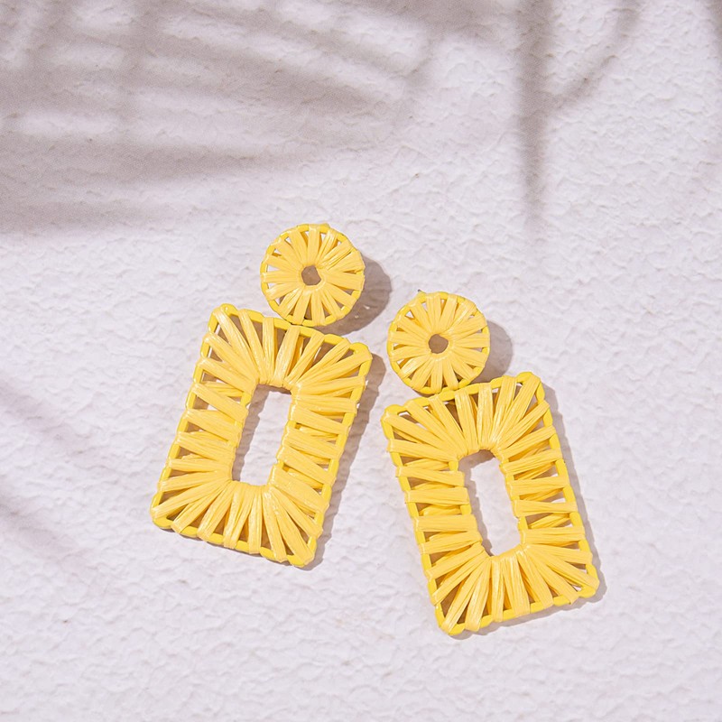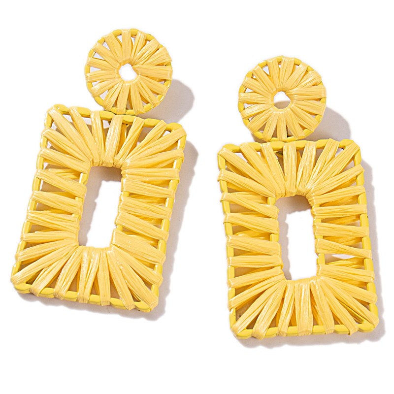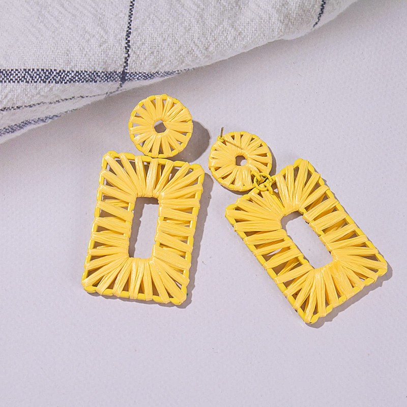 Statement Boho Drop Dangle Earrings - Geometric Handmade Straw Beach Earrings (Yellow)