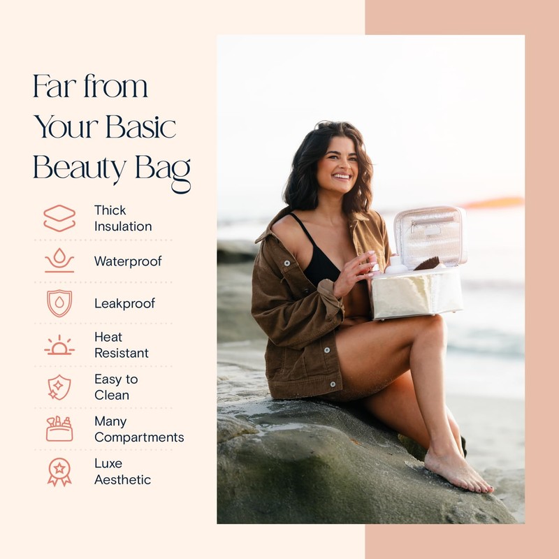 Stay Golden Large Insulated Makeup Bag - Waterproof Vegan Leather Beauty Travel Skincare Bag - Heat-Resistant Zippered Toiletry Designer Makeup Bag Shields Cosmetics from Melting, Freezing & Spoiling
