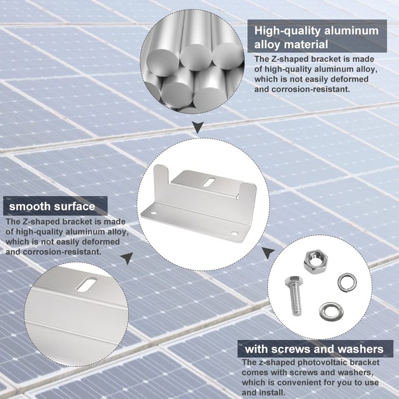 - 【Corrosion Resistant Aluminum Alloy Material】The Z bracket for fixing the solar panel is made of corrosion resistant aluminum alloy. It has the properties of good stability, rust resistance and is not easy to deform. Can help you repair the solar panel better.