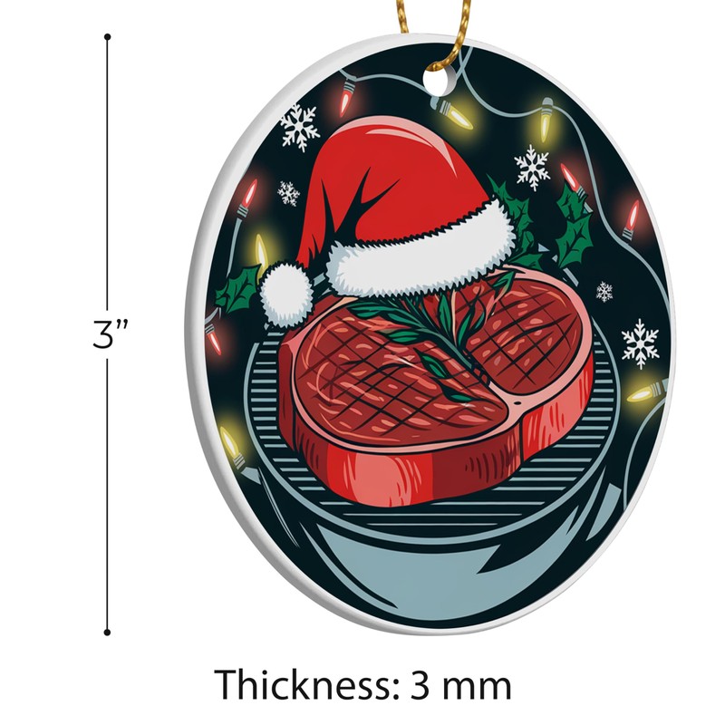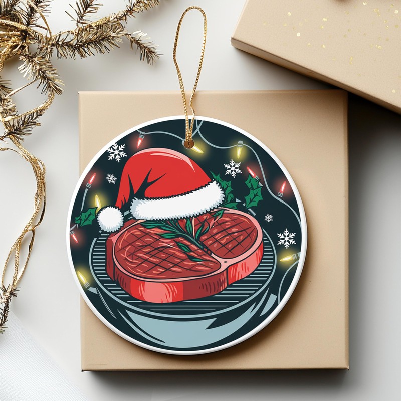 Steak Ornament Round Ceramic 3 inches - Juicy Steak with Santa Hat, Fairy Lights, and Holly for a Festive Culinary Christmas