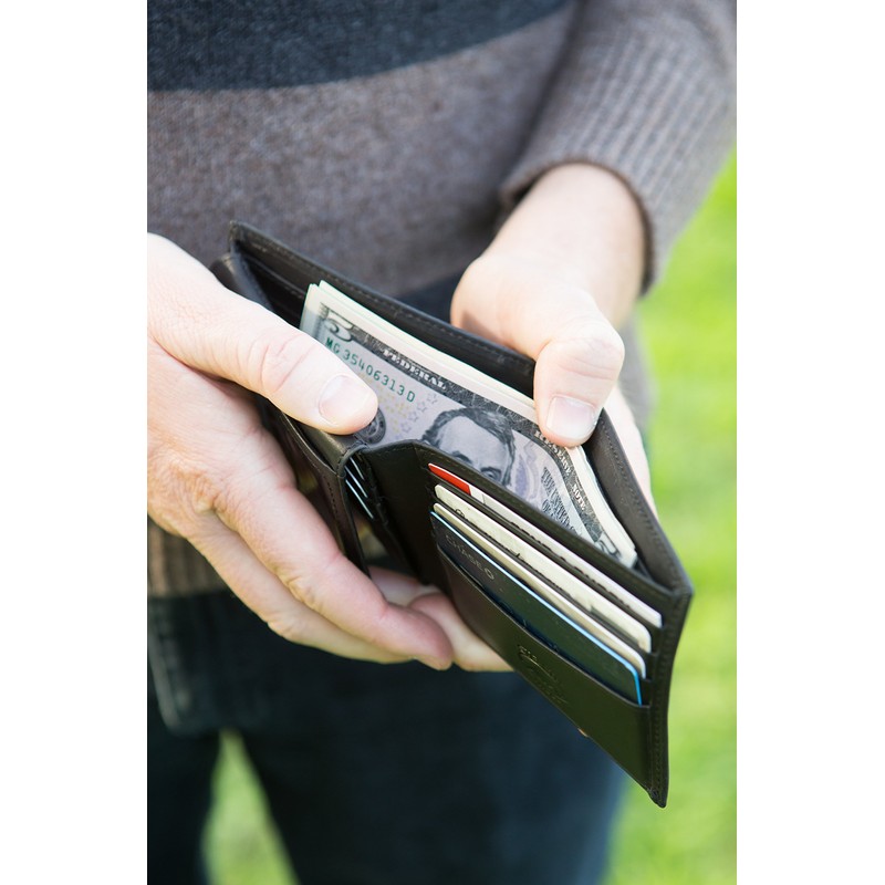 - Measuring 4.25" x 3.375" when closed this men's wallet has 8 card slots plus an ID flap and can comfortably fit 12+ cards. It also includes a divided billfold to keep your money and receipts organized.