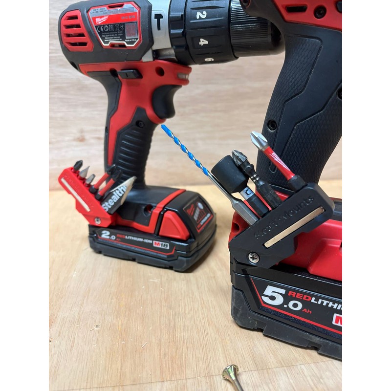StealthMounts 45° Bit Holders for Milwaukee M18 are the perfect addition for your drill or impact driver. The 45⁰ this Bit Holder can be mounted on either side of your drill or impact driver and are designed to be used by left-handed and right-handed people with equal ease. The 45⁰ Bit Holder mounts onto the drill of impact driver at an angle which is ideal for storing longer bits as the length is held backwards and out of the way of the work being done. In addition to 5 holes for bit storage there is room for a carpenter's pencil also, ideal for quick access when marking up. The 45⁰ Bit Holder is particularly useful when carrying out more than one type of fixing, switching bits is fast and easy. Designed specifically for use with Milwaukee M18 tools, providing a close and secure fit. The appropriate screws for mounting to your Milwaukee M18 tools is included. The exposed magnet allows for extra storage of bits and screws. Made in Great Britain, our 45° Milwaukee Bit Holders are made with extremely durable injection moulded plastic.