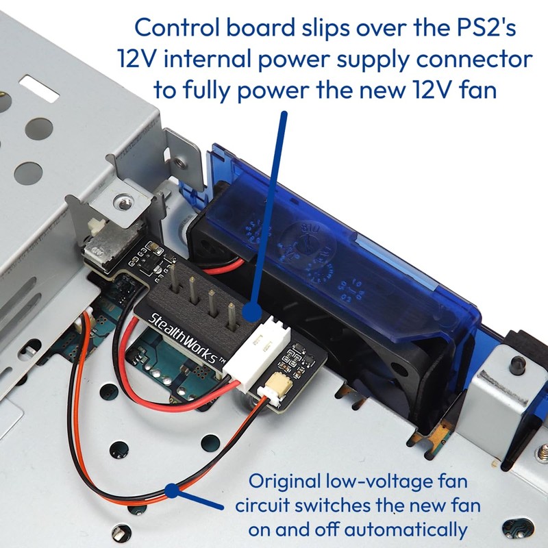 StealthWorks Fat PS2 Internal Quiet Fan Mod – 12V-Powered Sunon Super Silence Fan with 3-Speed Noise Adjust – for SCPH-39001 35001 30001R with an Original Power Supply – Clean, Solderless Install