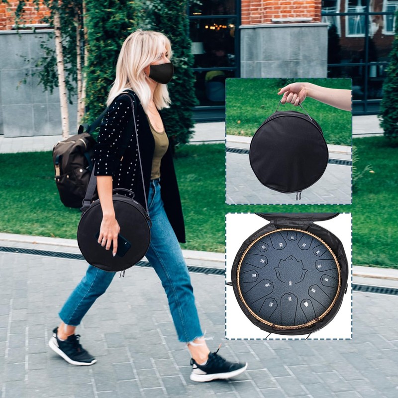 - 15 NOTES STEEL TONGUE DRUM:13 inch 15 notes steel tongue drum comes pre-tuned to the Mxied C-Key. The tone of the steel tongue drum is soft and melodious, you can feel the relaxation and joy from the heart.Which have a wider range of sound and can play more music. You can play drum with the included drum mallets or with you hands, and the included music book enable beginners to learn and play it more easily. Tongue drum comes with a carry-on bag for easy carrying