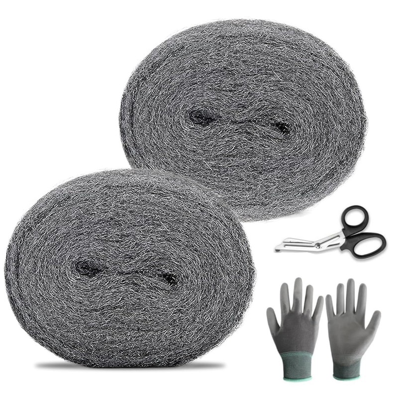 Steel Wire Wool Mice, 0000 Steel Coarse Wire Wool Gap Blocker with Work Gloves and Scissors, Wire Rodent Control DIY Filling Holes Fabric Kit (2 Pack x 3 m)