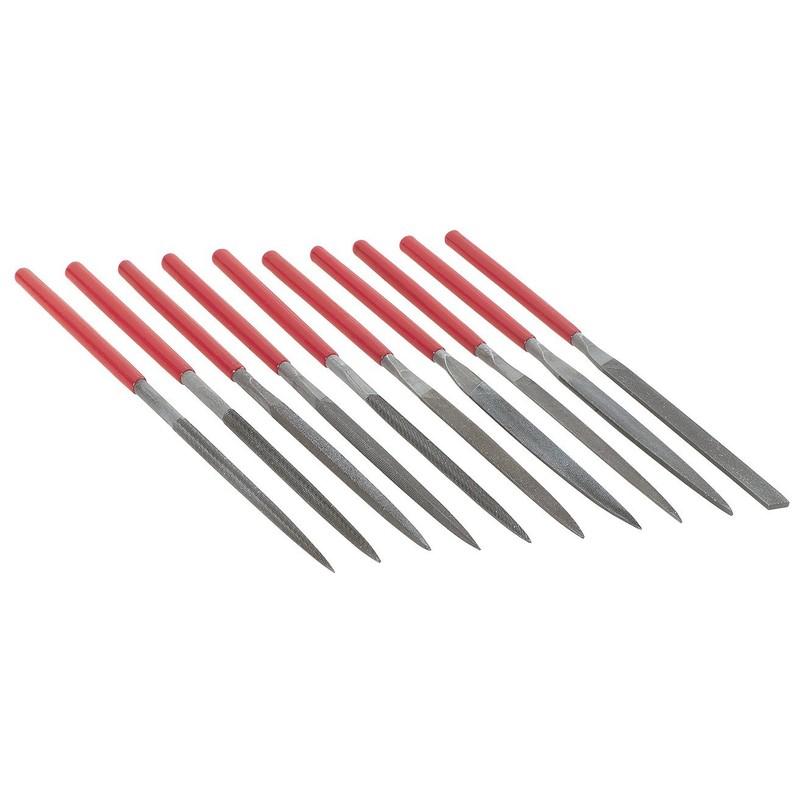 This Needle Nose File Set with vinyl grip handles includes ten profile shapes: round, half-round, flat, triangular, knife-edge, square and oval. All tips except the square nose flat file taper to a needle nose point for reaching into tight spots. Each file in the set measures 7-Inch long.