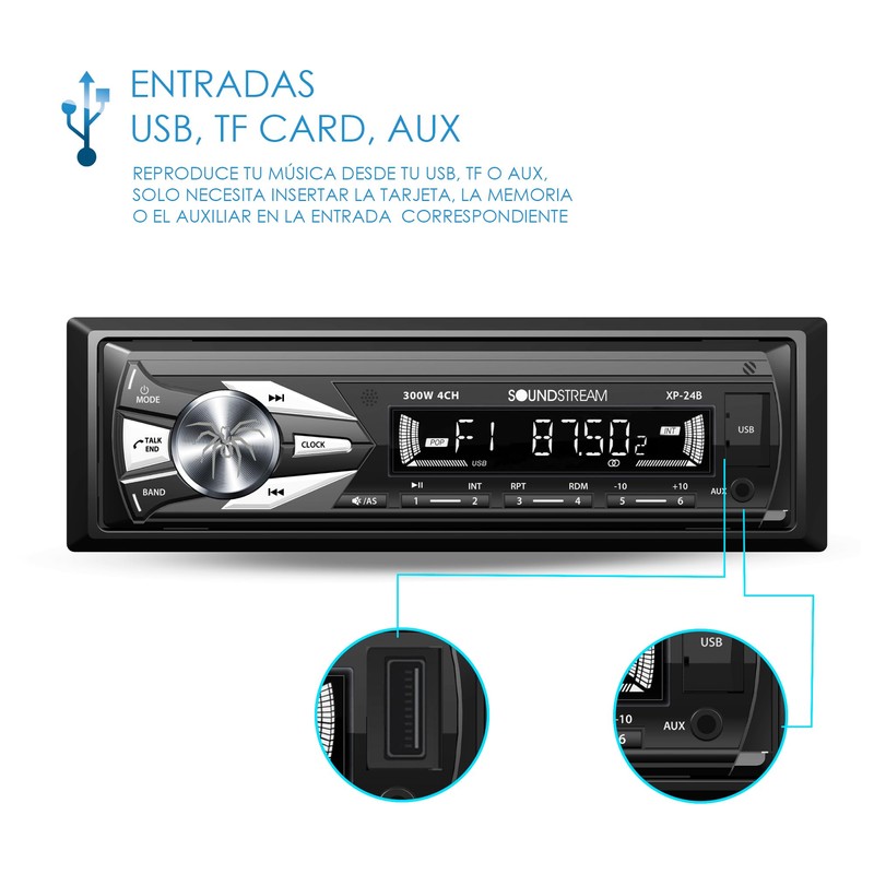 - Excelente diseño y desempeño en el nuevo autoestéreo XP-24B con el que los viajes en tu automóvil serán mucho más divertidos. Puedes disfrutar tus canciones favoritas como tu prefieras, en USB o en memoria SD, hasta 64GB, ambas con entradas frontales para mayor comodidad y cargar tu celular al mismo tiempo ya que cuenta con carga por USB.