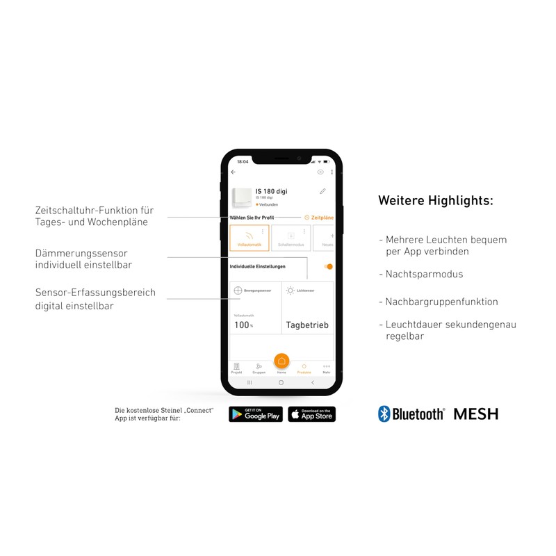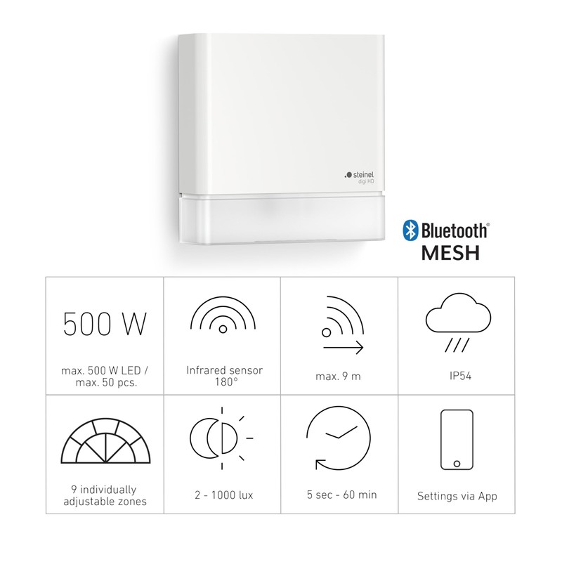 - Steinel "Connect" app - sensor area activity, time setting (5s - 60min. ), twilight threshold (2-1000 lx), granting access rights and networking to lighting groups can be set via Bluetooth mesh via smartphone or tablet