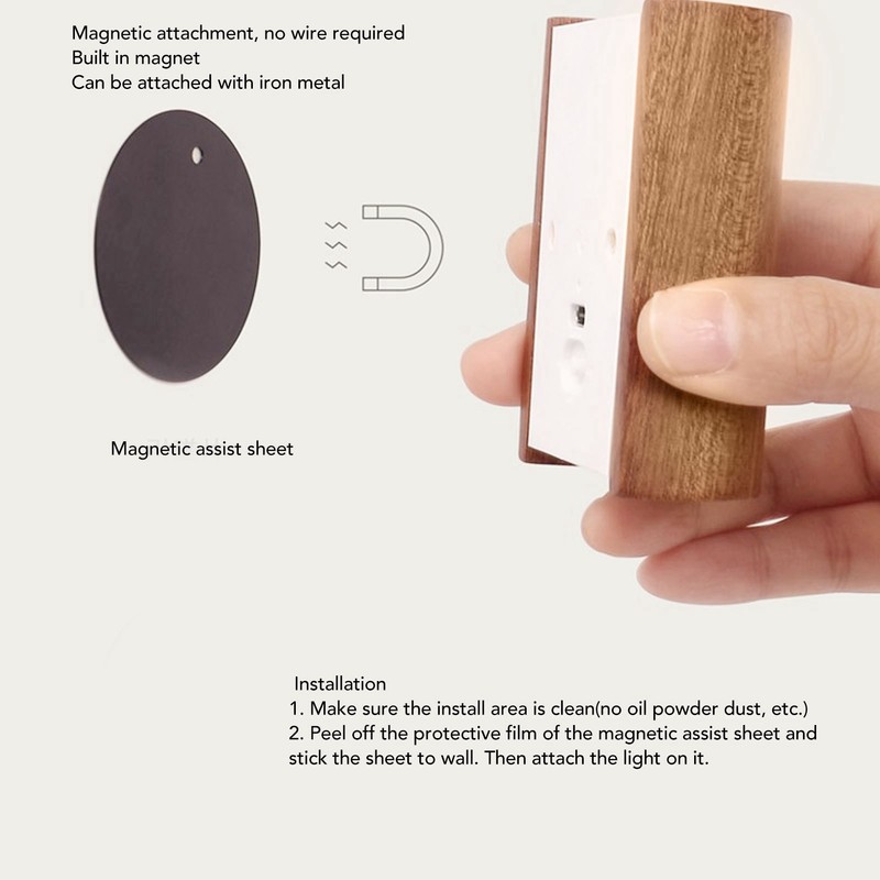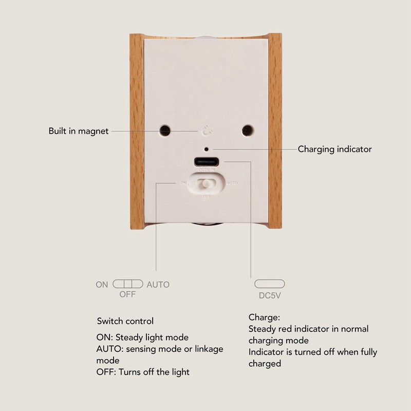 1、Wood Material: Made of beech wood with delicate texture, emits warm light to create a relaxing space. Transform the ordinary night light into a beautiful decoration for your home. 2、Magnetic Design: No drilling required, dual sided illuminates. Adjustable light direction by 360 degrees rotation. Equipped with motion and light sensor, the light turns on when someone approaches and turns off after they leave. Choose from sensor mode or steady light mode. 3、Dual Sensor Modes: Combines motion sensor and light sensor. The light has a 15 second delay before turning off. Upward vertical sensing range of 2 to 3 meters, and horizontal sensing range of 120 degrees for 3 to 4 meters. 4、Long Lasting Battery: Built in 500mAh polymer lithium battery. One full charge provides 8 hours of continuous light in steady mode, and 1 to 3 months of light in sensor mode. Features a Type C charging port compatible with adapters, power banks, and laptops. 5、Intelligent Night Light: Convenient light source for dark areas. Can be used as a night light or wall light, suitable for bedrooms, bathrooms, stairways, hallways, and more. Enhance the ambiance and provide lighting whenever you need it.