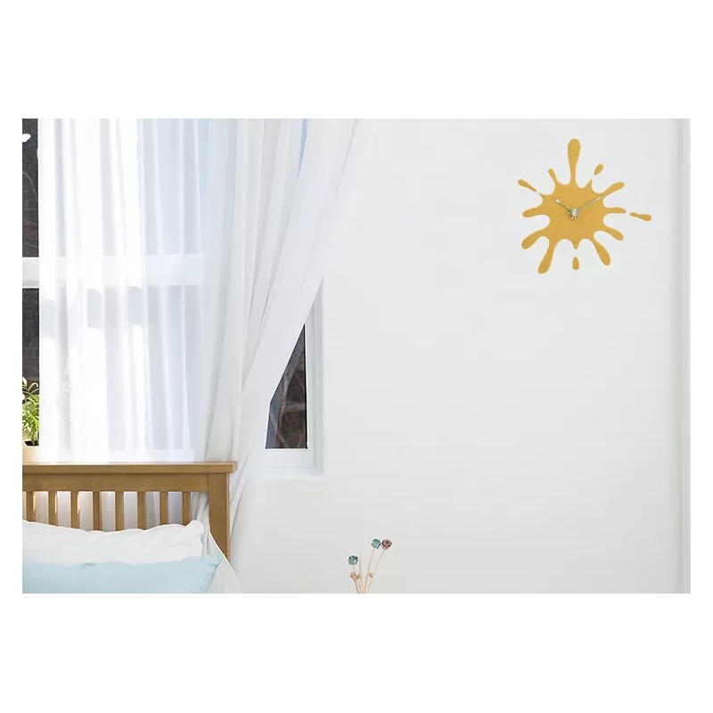 Measures 19.5” X 18.8” and features a matte yellow FORESCOLOR ecoboard dial that is 0.35” thick and in the shape of a splash of paint. The clock hands are made of a reflective mirror acrylic. Operates with 1 AA battery which is not included.