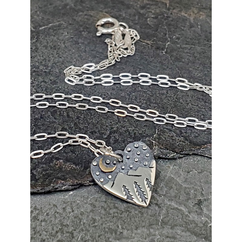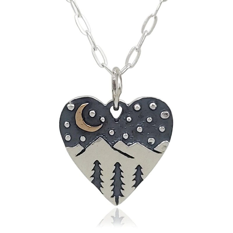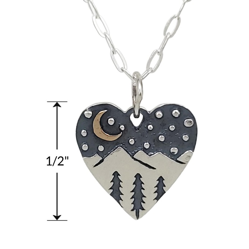 Sterling Silver and Bronze Mountain Range Stars Moon Heart Charm Necklace, 18"