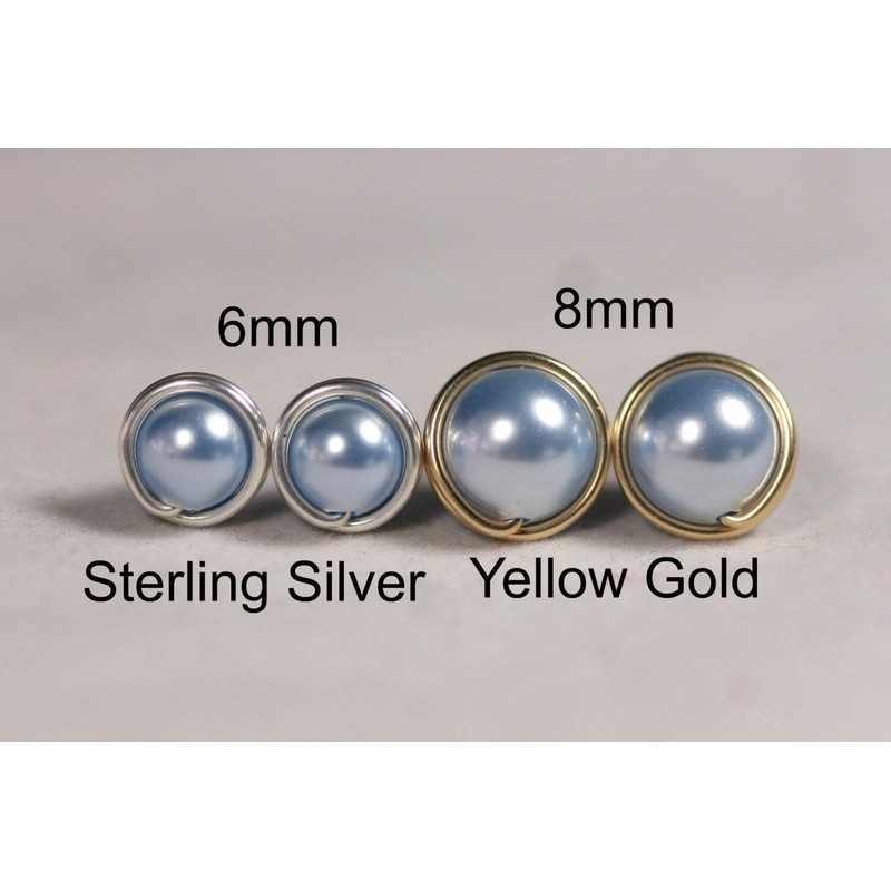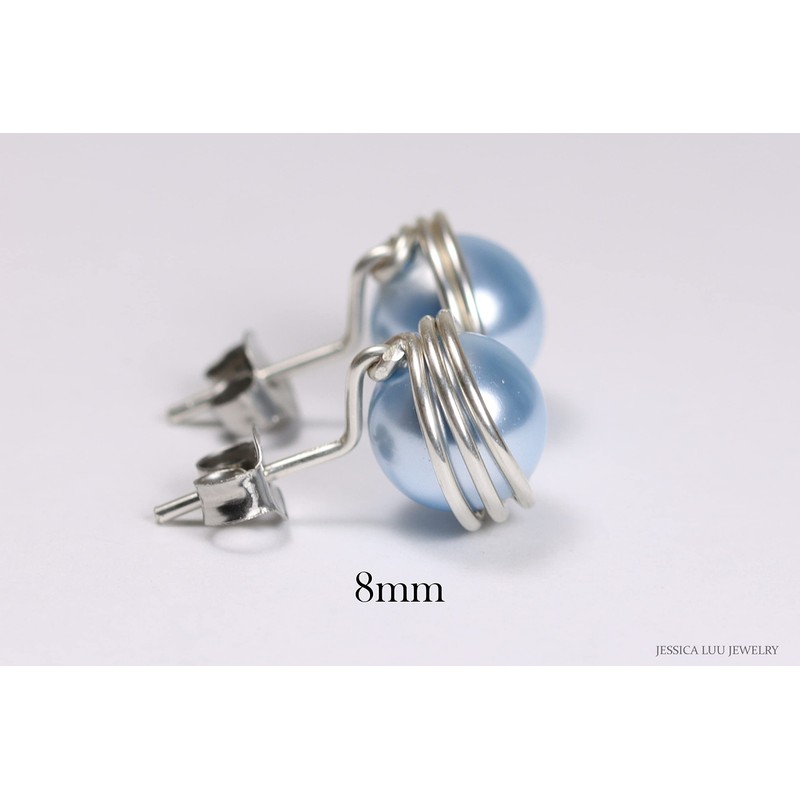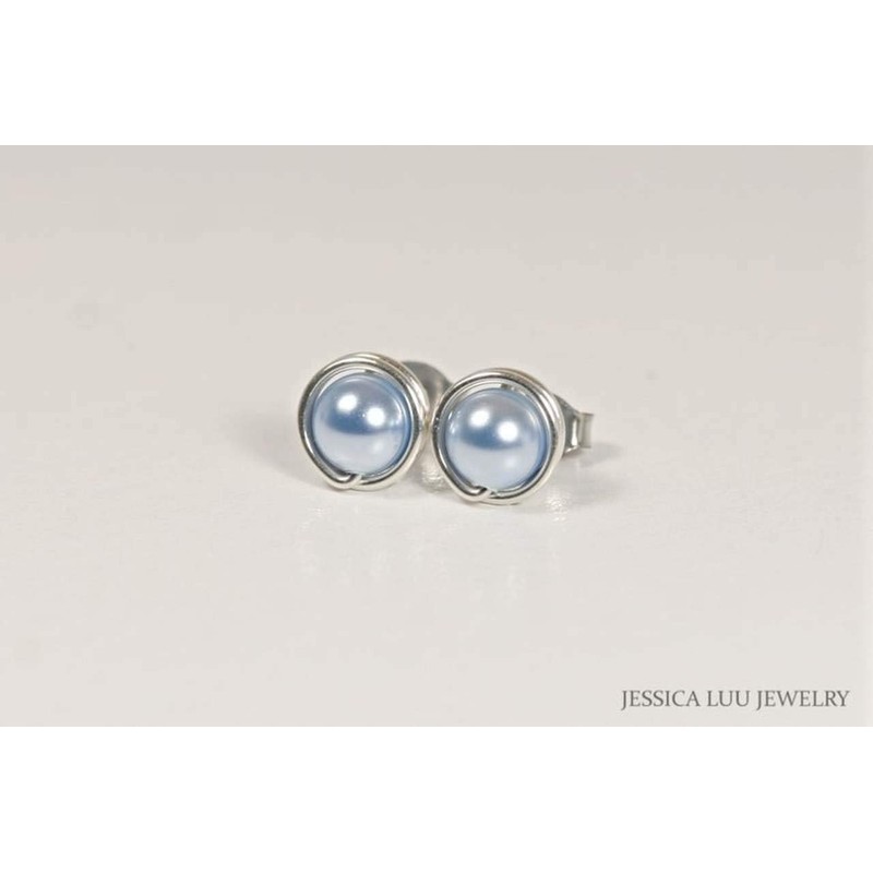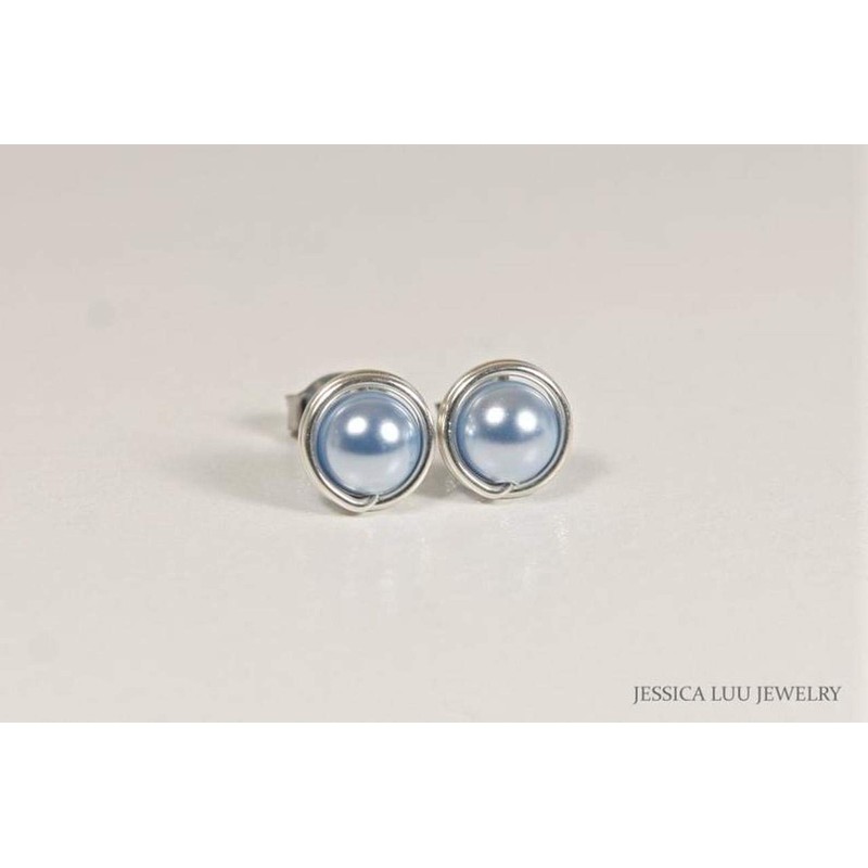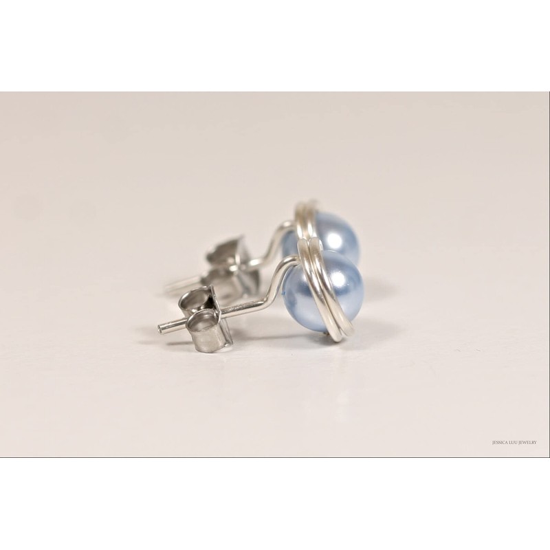 Sterling Silver Light Blue Pearl Stud Earrings Wire Wrapped Handmade