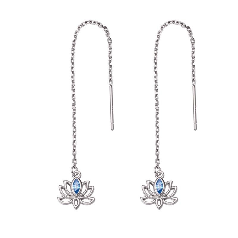 Sterling Silver Lotus Flower Threader Earrings, Blue Crystal, S925, 9x8mm