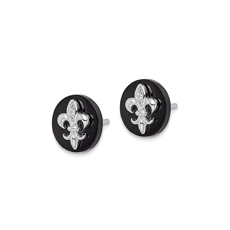 - Sterling Silver Rhodium-plated CZ Fleur de Lis Onyx Circle Stud Earrings