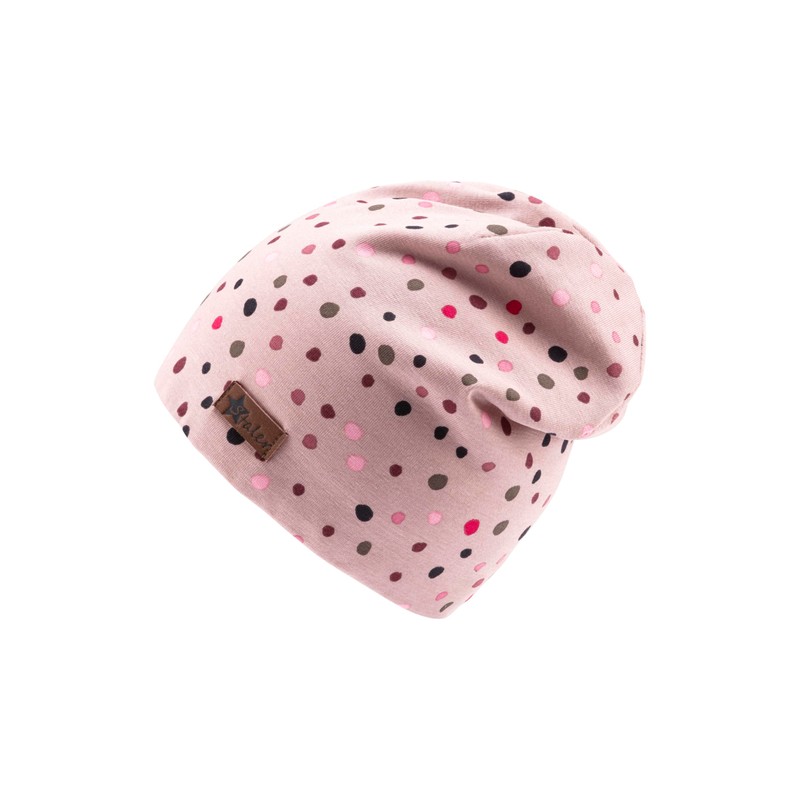 - For girls – warm beanie hat with dots and lining made of cotton fleece. The material is soft and supple and does not cause pressure points on the head.