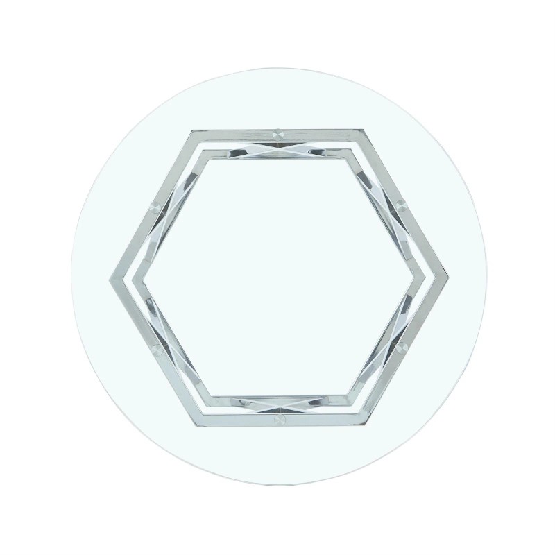 A sophisticated modern silhouette, the Escondido Cocktail Table offers a sparkle to any room. A tempered glass top and chrome plated base combines with geometric angles in an architecturally styled base. The 36-inch round table works well with sectionals and sofa and loveseat sets to add a gentle flowing aesthetic and easy access around the table.