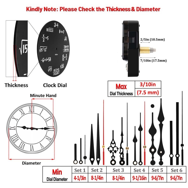- The total length of the shaft of this clock Movement is 7/10in (17.5mm), with a thread length of 2/5in (10.5mm) that allows a clock face up to 3/10in (7.5 mm) thick. It can be used in a clock dial diameter from 4-1/3in to 9-6/7in by different clock hands set.