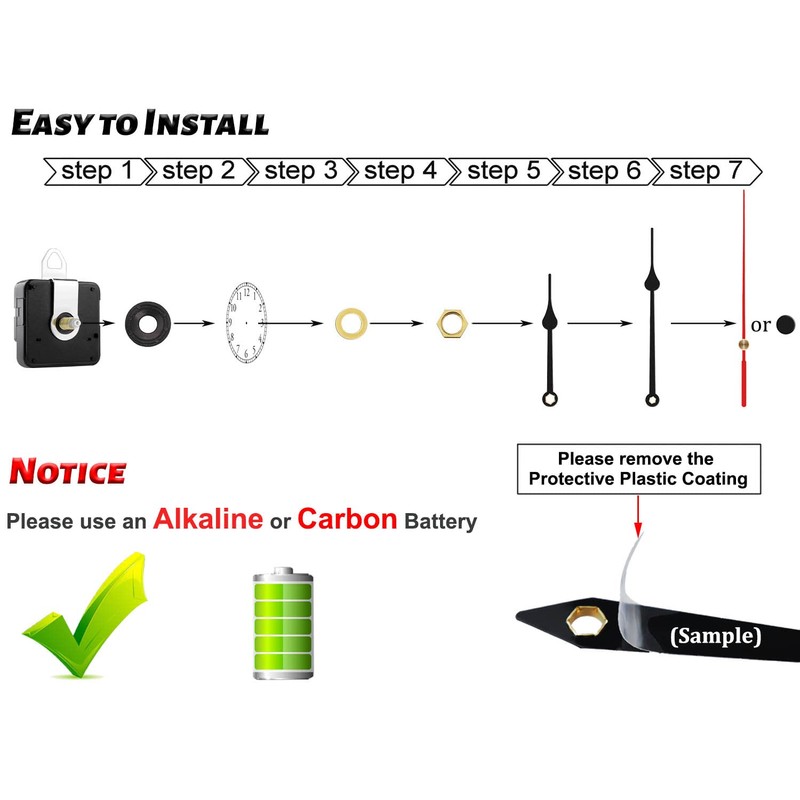 - What You Get: 2 non ticking clock mechanisms and 6 set clock hands. Also included: 2 wall nails, 2 metal hooks, 2 plastic washers, 2 brass washers, 2 brass nuts and 1 instruction sheet. StFlyBro worry-free 36-month warranty and Friendly Customer Service.
