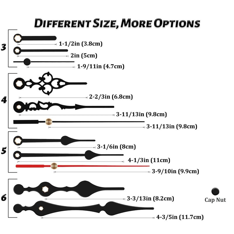 - Six different style & size Clock Hands are included. An appropriate style & size set can fit for many clocks. All sets are good for replacement, repair and making of clocks.