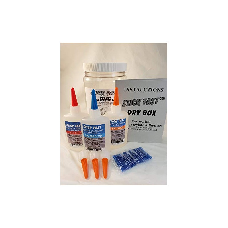 Stick Fast Cyanoacrylate (CA) Dry Box Glue Kit, 3 Bottles- Thin, Medium, Thick, (2.5 oz), Storage Container, Plus Free 3 Replacement Tips, 3 Flexible Tips, Instruction Manual