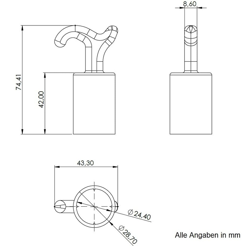 - Inner Diameter: 2.4 cm; Height of Socket: 4.0 cm; Total hook length: 7.6 cm