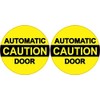 This product contains two circular stickers; each sticker is 3 inches wide by 3 inches tall when applied. The words, AUTOMATIC DOOR, are printed in black letters on the stickers' yellow background; The word, CAUTION, appears in yellow letters on a black bar in the middle of each sticker. These carefully crafted stickers are durable and easily visible, making them ideal for display in a variety of settings and scenarios!