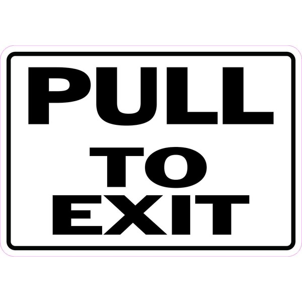 This sticker is 5 inches wide by 3.5 inches tall when applied. It features the words, PULL TO EXIT, in black letters on a white background. A black border accents the edges of the sticker. The pink line in the image shows where the sticker is cut; the pink line is not printed on the sticker. This carefully crafted product is durable and easily visible, making ideal for display in a variety of settings and scenarios!