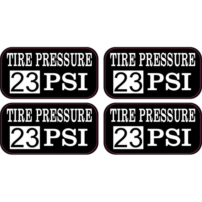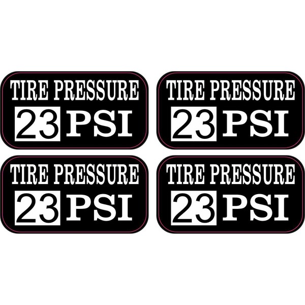 Tire Pressure 23 PSI Vinyl Stickers Description: This product contains four stickers. Each sticker is 2 inches wide by 1 inch tall when applied. Each sticker features the words, TIRE PRESSURE 23 PSI; the number, 23, is printed in black letters on a white square, and the remainder of the text is printed in white letters on a black background. These carefully crafted products are durable and easily visible, making them ideal for use in shops and garages.