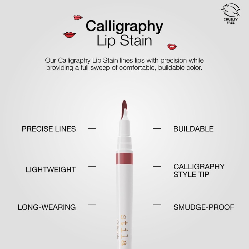 - PRECISE LINES: Our double-duty Calligraphy Lip Stain lines lips with precision while providing a full sweep of soft buildable color and provides 8-hours of continuous wear. This non-drying, lightweight formula stays on throughout the day, subtly fading to a natural wash of color