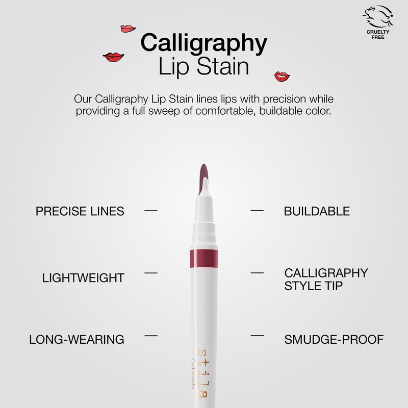 - PRECISE LINES: Our double-duty Calligraphy Lip Stain lines lips with precision while providing a full sweep of soft buildable color and provides 8-hours of continuous wear. This non-drying, lightweight formula stays on throughout the day, subtly fading to a natural wash of color.
