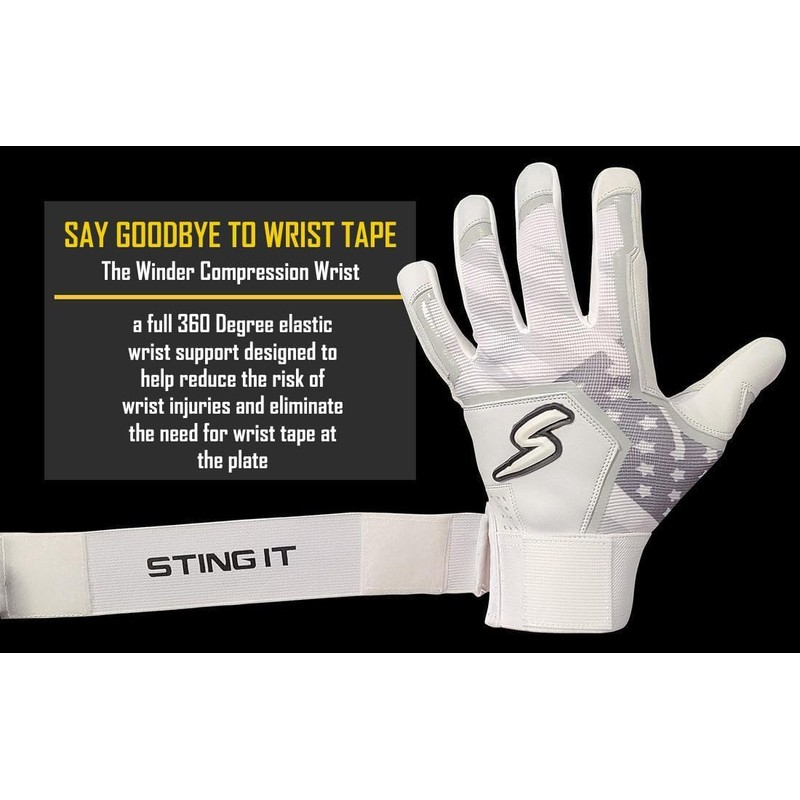 Say GOODBYE to wrist tape! Our Winder Series Batting gloves feature a strong full 360° Elastic wrist strap for the ultimate wrist support. Combined with our Patent Pending Secure Seam Technology and you have the absolute best batting glove for performance and durability that has ever existed! Made from top-of-the-line ultra soft and durable sheepskin leather and ultra-durable and breathable Elasti-Mesh backing. Designed by baseball players for reliable performance. You will have the whole team asking you where they can get a pair!