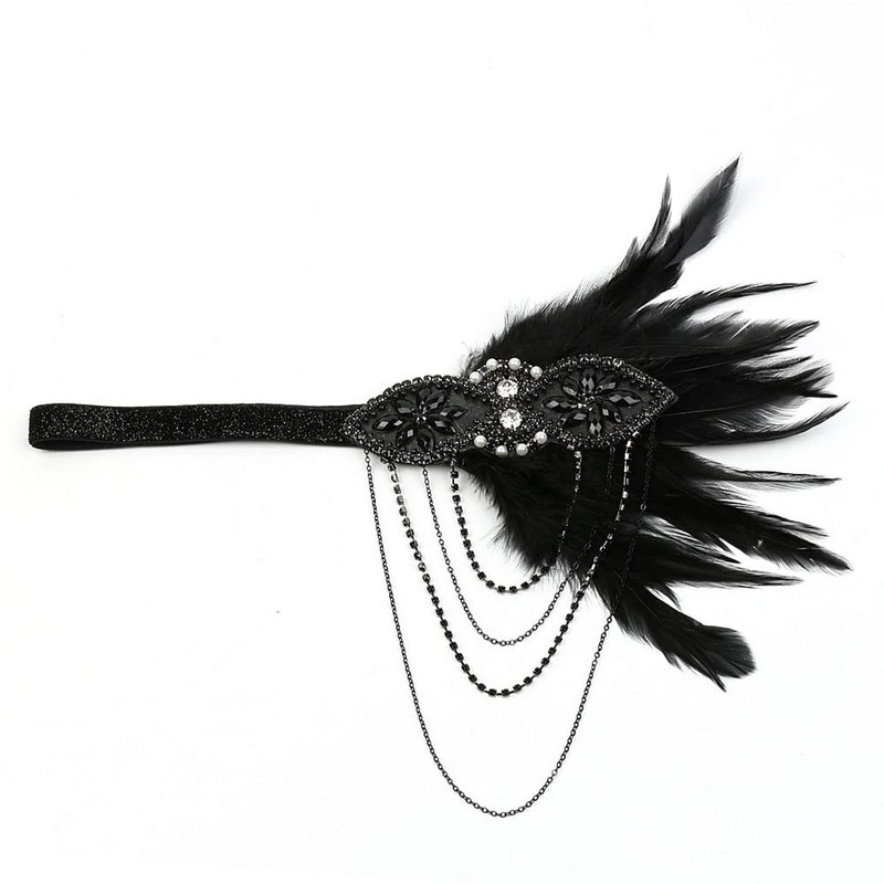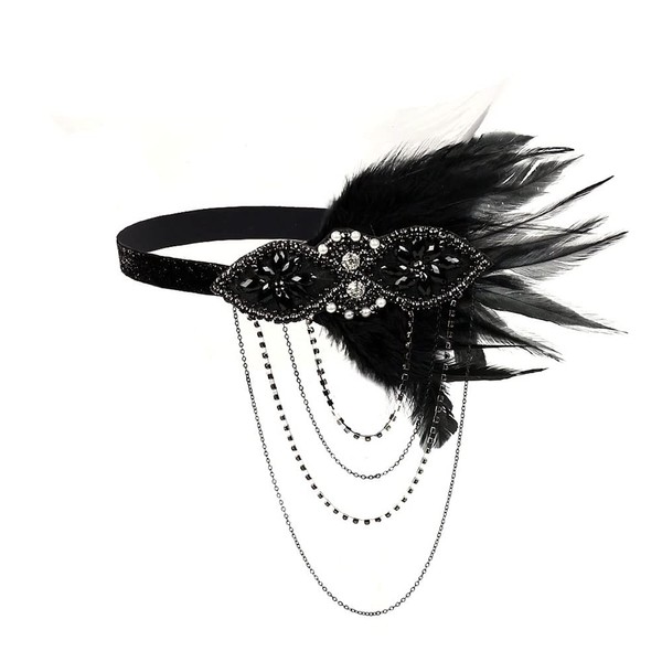 STIOEDYUAN 1920's Flapper Headband Gatsby Feather Headpiece Rhinestone Tassel Headdress Bridal Hair Accessories Head Chain For Women (Black)