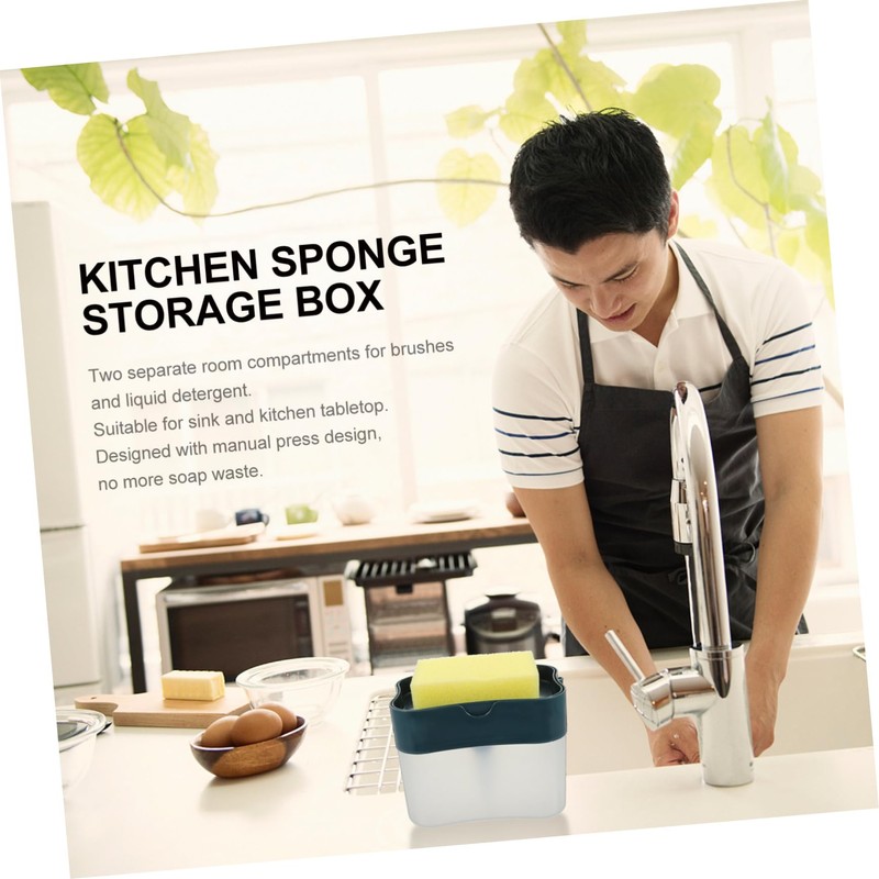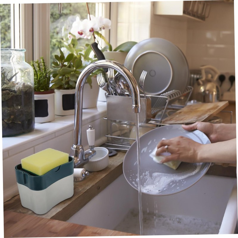 dishwashing soap dispenser Designed with manual press design, no more soap waste.sink liquid soap dispenser Two separate room compartments for and liquid detergent.dish detergent dispenser Suitable for sink and kitchen tabletop.Sponge Box It is a kitchen sponge storage box, also as a dish soap pump dispenser