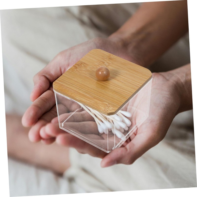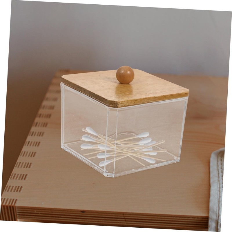 STOBAZA Makeup Cotton Organizer Container with Wooden Lid Elegant Storage Box for Cotton Swabs Balls and Rounds Makeup Vanity Organizer for Bathroom and Dressing Table