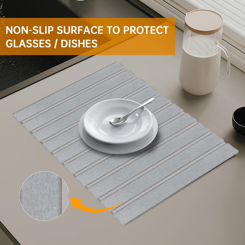 Stone Dish Drying Mat for Kitchen Counter, 24"x16" Collapsible Large Stone Dish Drying Mat Eco-Friendly Absorbent Diatomaceous Earth Mats for Cups Dishes Bottles(Medium grey)