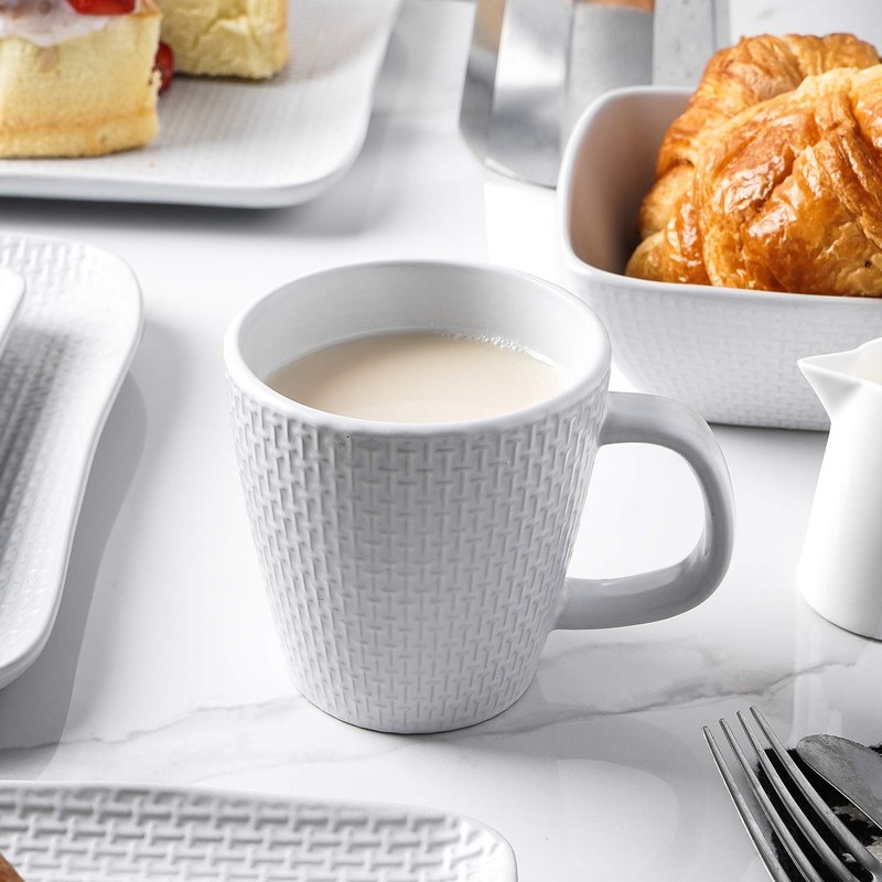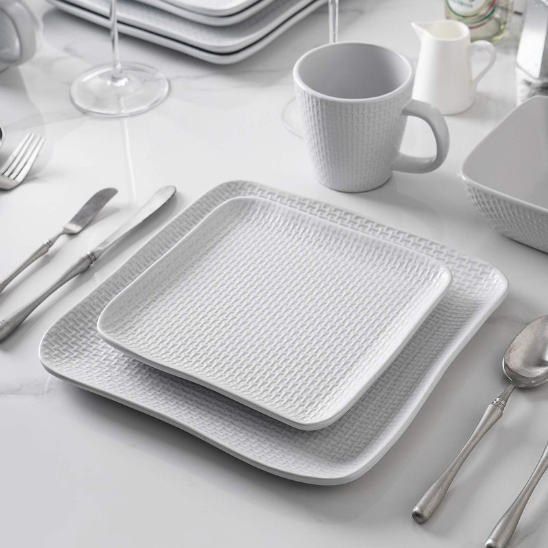 - 16 Piece Dinnerware Set – White weave design with embossed textured feel. Stoneware set includes 4 square dinner plates, 4 salad plates, 4 bowls, 4 round mugs.