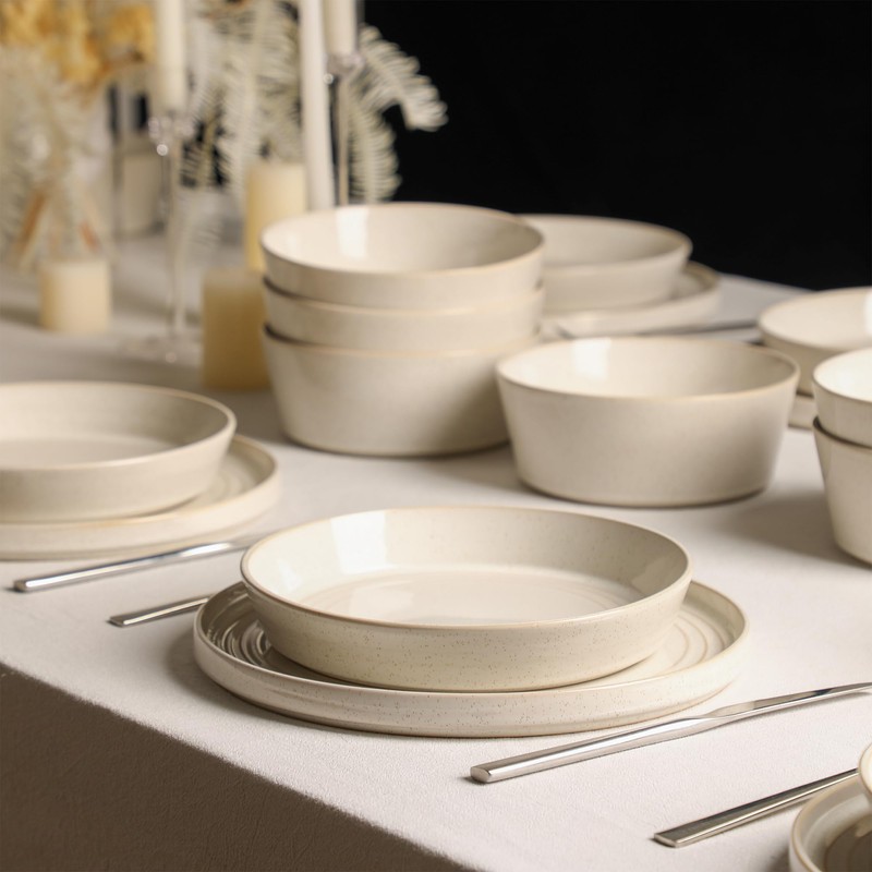 - Includes 24 pieces: 8 dinner plates (10.7”), 8 pasta bowls (8.85”), and 8 cereal bowls (7.1”)—a complete stoneware dish set for serving a group of eight.