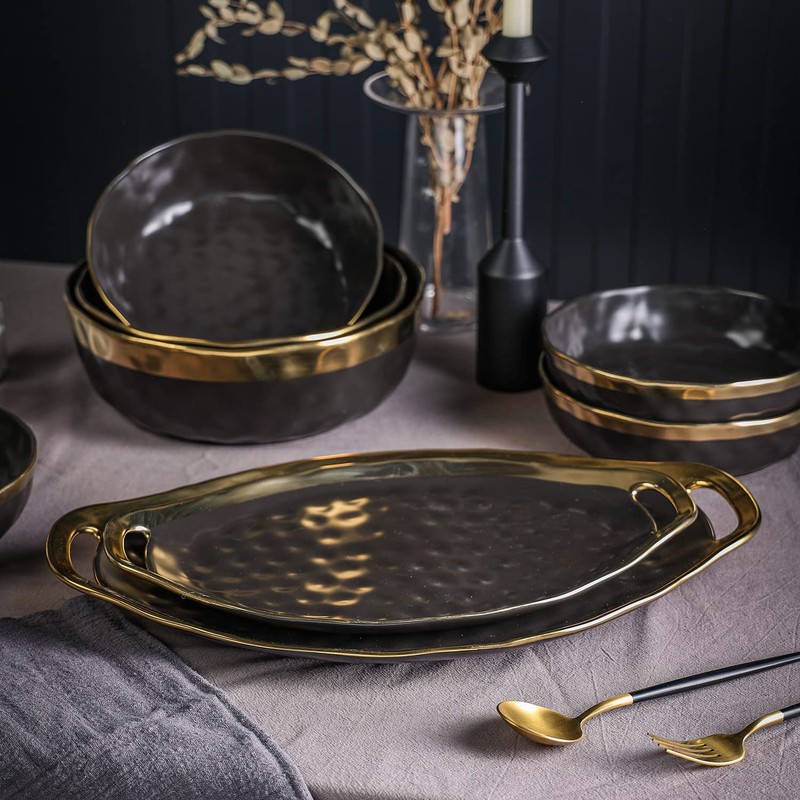 Stone Lain Florian Porcelain Large and Medium Oval Platters with Handle, Service Set, Black with Gold Rim