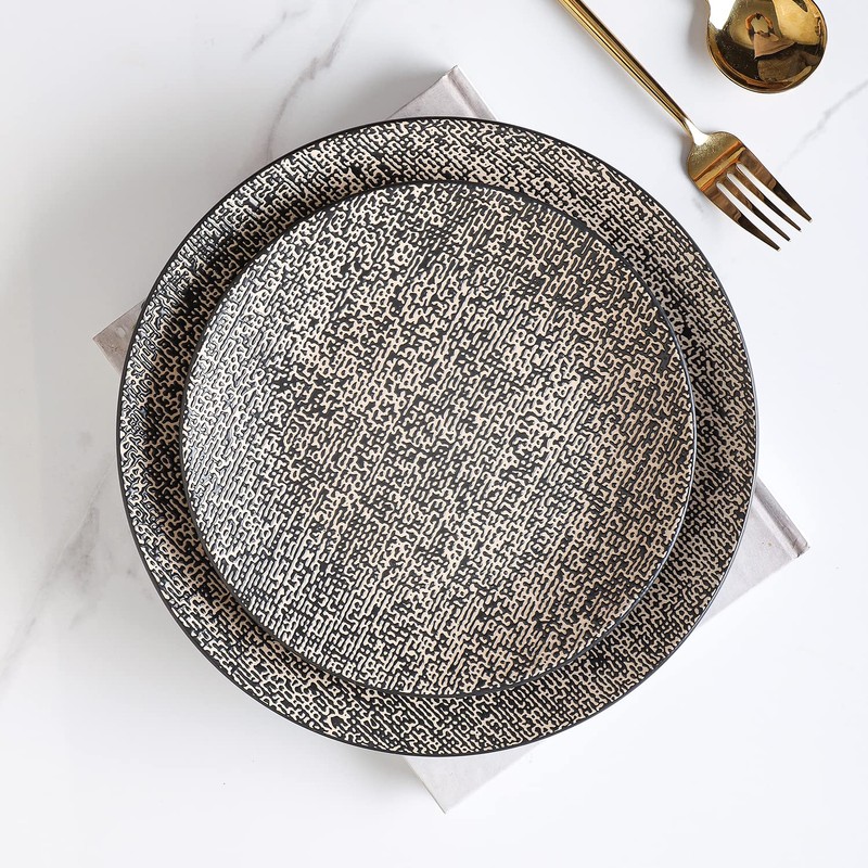• UNIQUE DISH DESIGN - Rustic stoneware for every day dining, this brown and black uneven textured dishware is the perfect touch to your farmhouse or neutral colored kitchen and is sure to make a statement at all your meals.