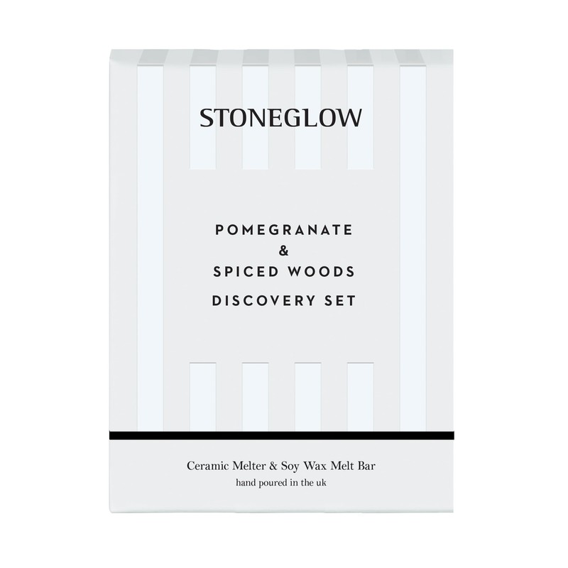 Stoneglow Modern Classics Collection - Pomegranate & Spiced Woods - Ceramic White Wax Melter & Soy Wax Melt Bar Discovery Set