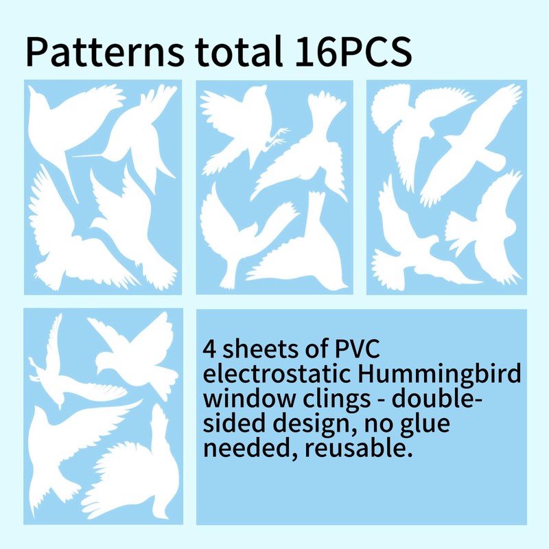 • 【Window Decals to Prevent Bird Strikes】4 sheets 16 pieces bird stickers and a plastic scraper, to prevent bird strikes. These window decals can be used as a bird deterrent and beautiful home decor.