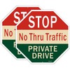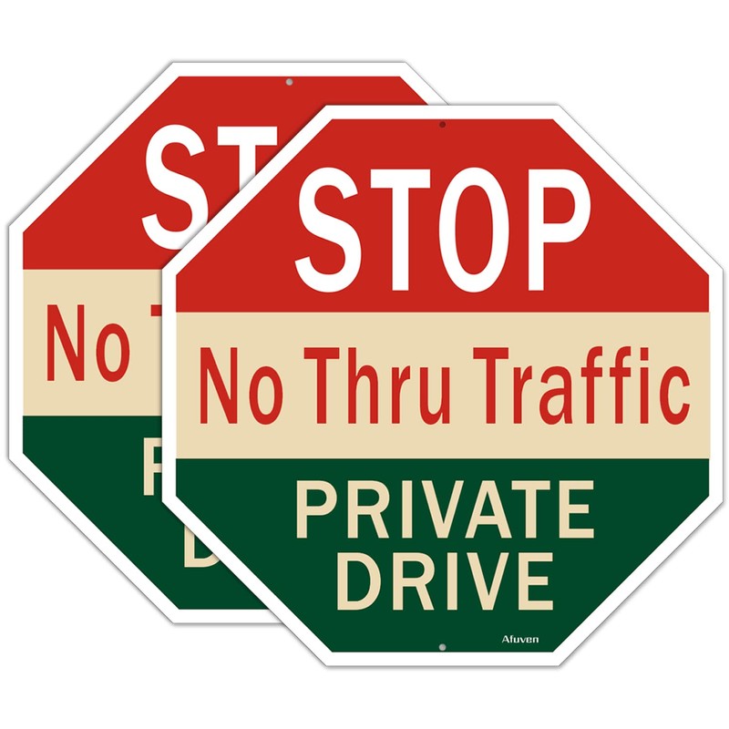 • The "Stop No Thru Traffic Private Drive" sign, with a Clearly visible Red, Beige, and Green design will definitely attract the attention of the drivers. the sign clearly informs motorists to not enter a private road. It is often posted on private roads, drive to help protect privacy and minimize unwanted traffic and noise.