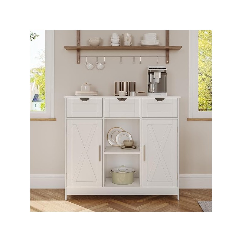 Storage Cabinet, Coffee Bar Cabinet with 2 Adjustable Shelves, 3 Drawers, and 2 Doors, for Bathroom, Kitchen, Living Room (White)