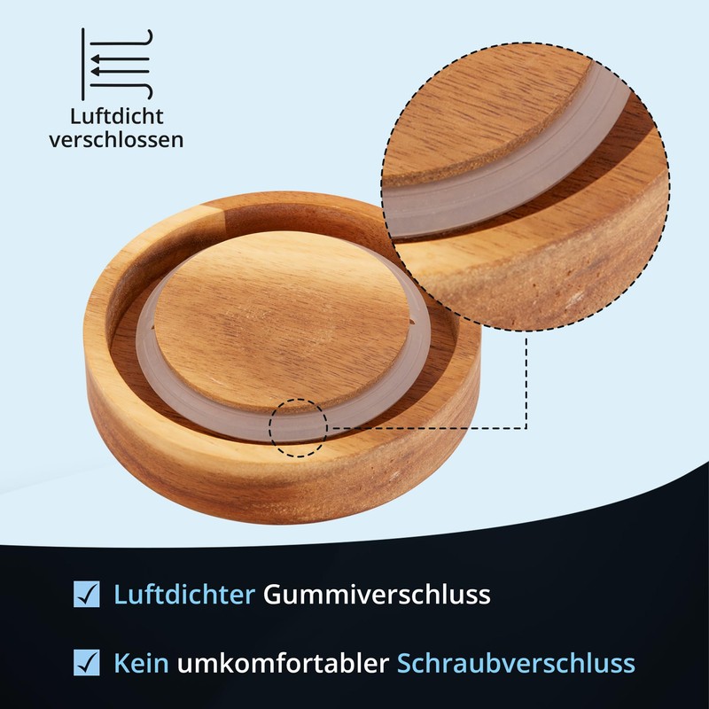- The wooden lid is equipped with a silicone seal that ensures an airtight seal and protects your sugar from moisture and unwanted visitors. Always enjoy dry and lump-free sugar.
