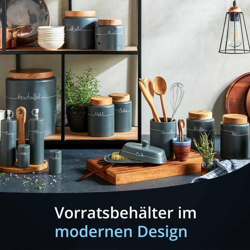 Storage Jars Set Ceramic Anthracite Wood Lid Coffee Container Potato Box Onion, Sugar