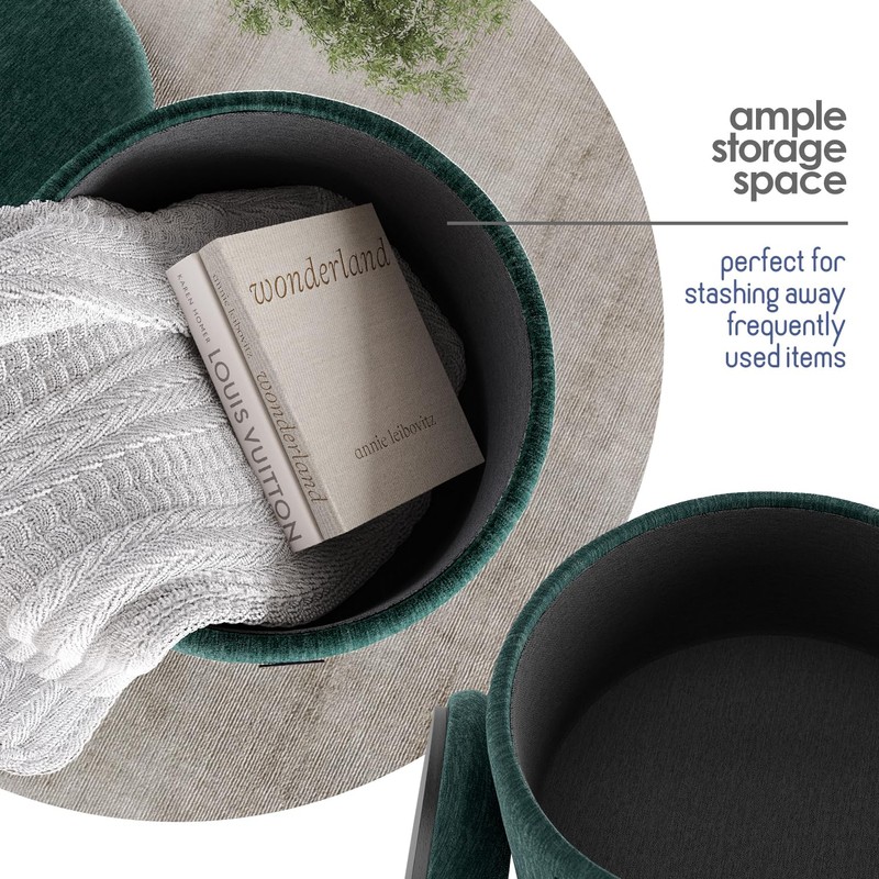 - Green Storage Ottoman: Elevate your home decor with StorageBud’s Round Green Ottoman with Storage, featuring plush textured velvet upholstery, spacious inner storage, and a dual-sided lid for multipurpose use as a footstool, foot rest, or side table.